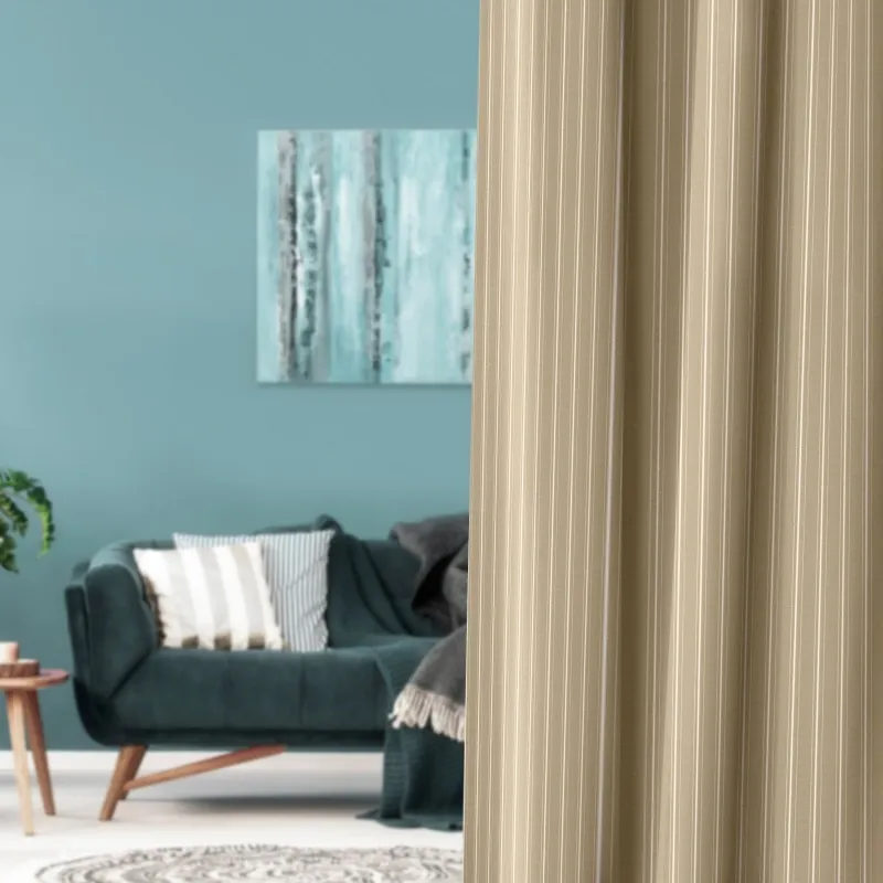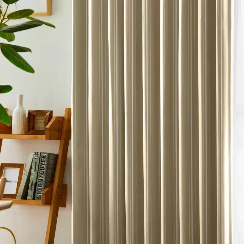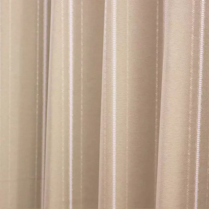 リボンテープで引かれたかの様なストライプと糸の光沢がキラキラ光るストライプが印象的な遮光3級のカーテンです。程よい高級感がリビングなどに使いやすいです。