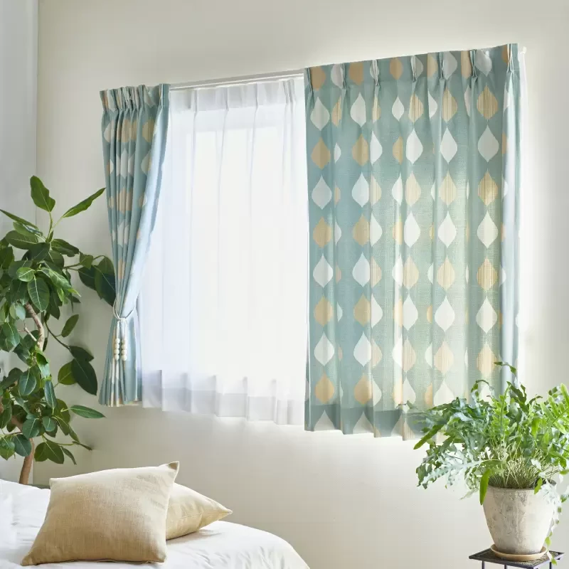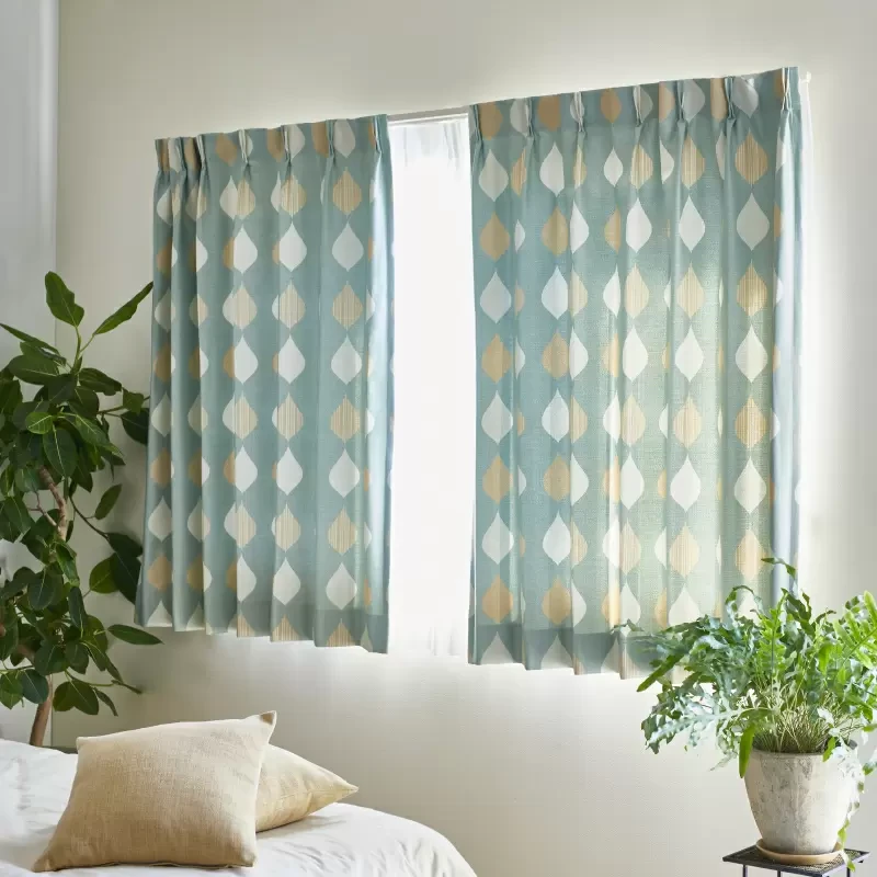 雨粒とお菓子のドロップをモチーフにした、キュートなデザインの遮光3級ドレープです。北欧インテリアにマッチする、ややグレイッシュなトーンで、子供部屋はもちろん、女性のお部屋やリビングと、幅広くお使い頂けます。モダン、ナチュラル、カジュアルテイストとミックスして、自分らしいスタイルに仕上げるのもおすすめです。家庭洗濯OK(ウォッシャブル)なので、お手入れも簡単。カラー:グレイッシュなグリーン色
